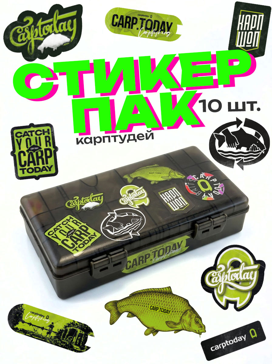 Набор из 10 ярких фирменных наклеек Carptoday для тех, кто живёт карповой рыбалкой. Клейте на тэклбоксы, вёдра для прикормки, родподы, термосы, автомобиль или ноутбук — пусть ваше снаряжение и вещи говорят о том, что вы карпятник.
