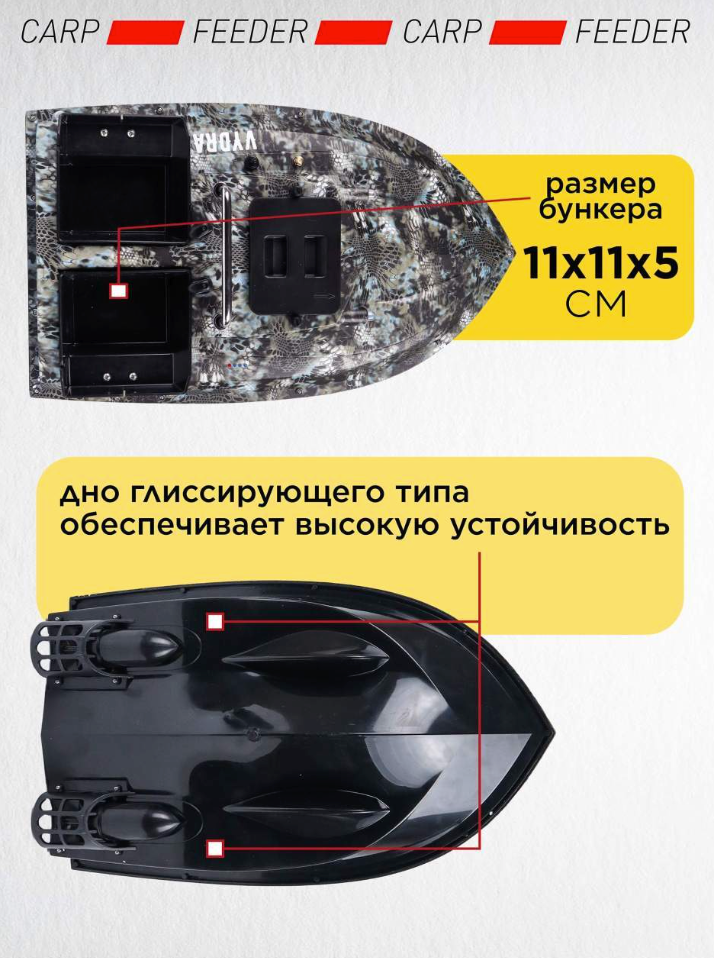 Кораблик оснащен двумя отсеками общей вместимостью 1500 грамм. Разделение на две части позволяет сбрасывать прикормку порциями, что упрощает процесс. Открытие и закрытие отсеков осуществляется одной кнопкой на пульте управления.