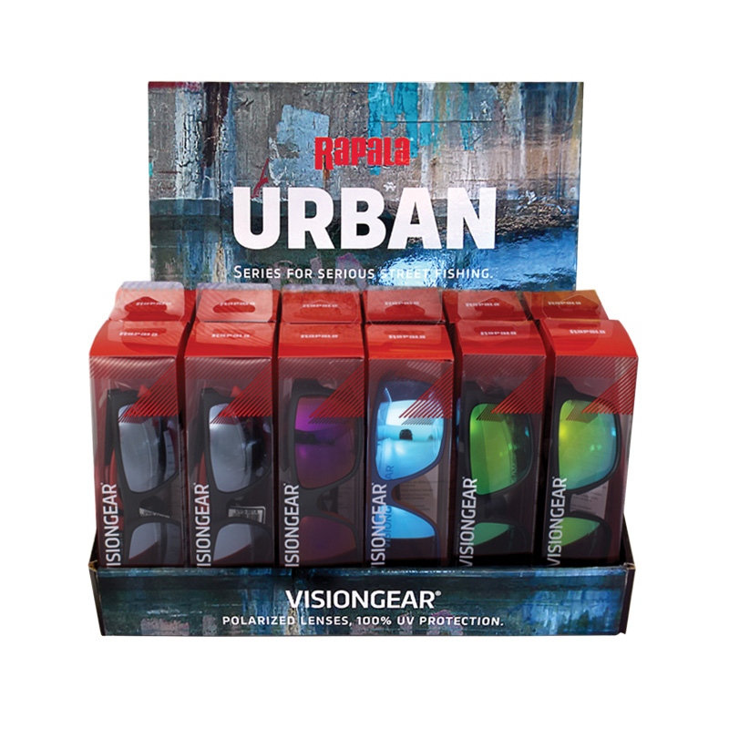 Удобная упаковка, включающая в себя три расцветки очков Urban, по четыре экземпляра каждой позиции.