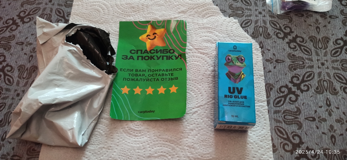 торговая марка карптодей зарекомендовала себя только с лучшей стороны, я ещё не использовал этот клей, но не сомневаюсь в том что он хороший своими свойствами - затвердевать при засветки уф фонариком что даёт до засвечивания время для манипуляции и корректировки склеиваемых элементов и при высыхании не оставлять следов забеливания а оставаться прозрачного цвета, что при изготовлении например поводков имеет значение. к тому же в случае попадания на кожу пальцев не будет эффекта моментального склеивания и высыхания и можно спокойно убрать вещество.