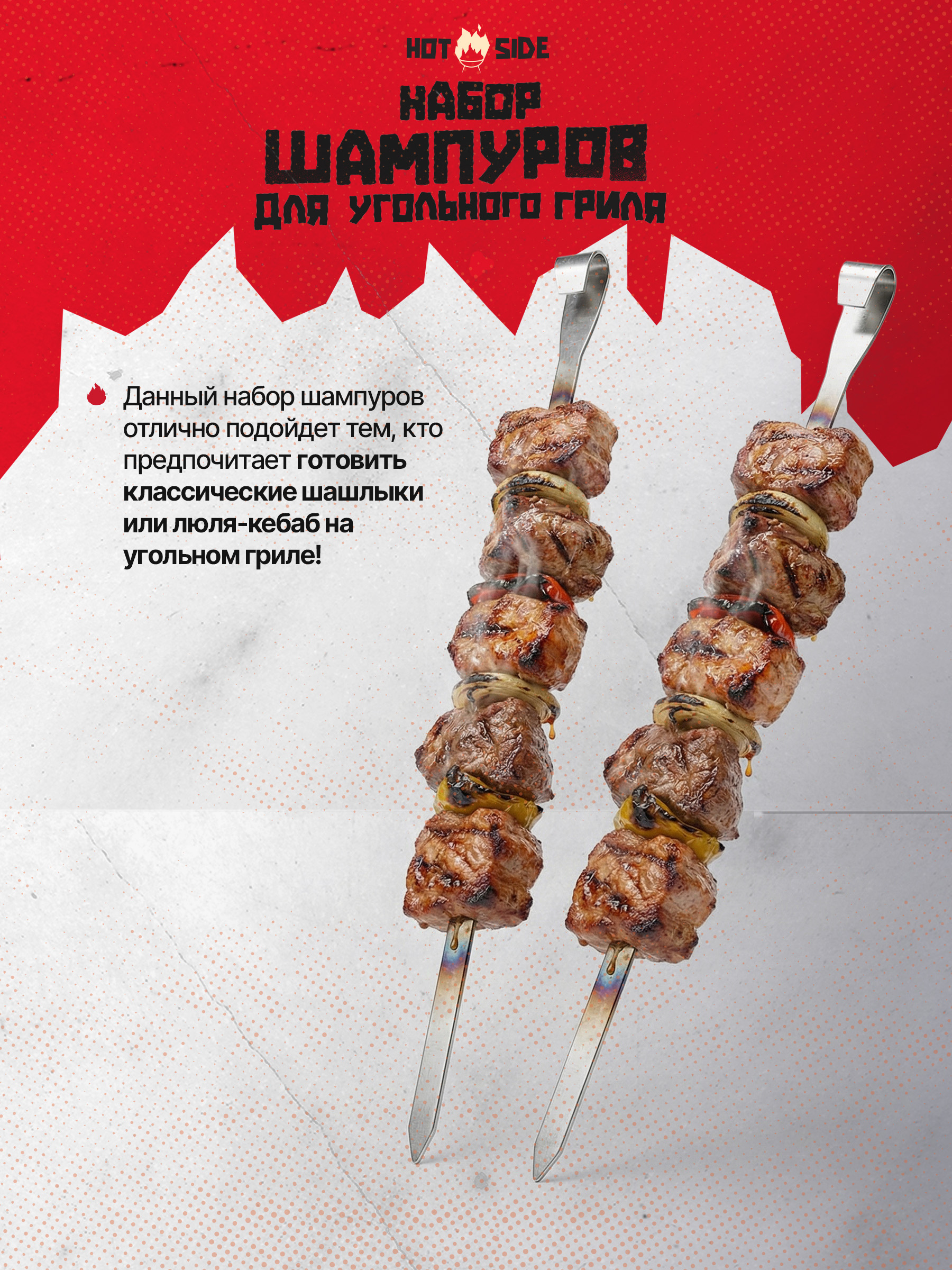 Шампуры идеально подходят для специальной шампурницы HOT SIDE. Благодаря данной подставке увеличивается расстояние между продуктом и углями, что позволяет готовить очень сочные шашлыки из свинины, говядины, курицы или овощей!